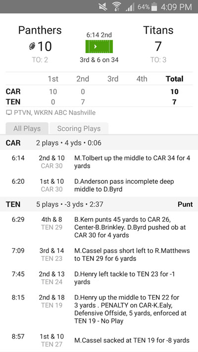 به روز رساني امتيازات جدول NFL(ليگ فوتبال ملي) و وضعيت بازيها، داشتن بالاترين اطلاعات از تيم هاي مورد علاقه سفارشي سازي برنامه فهرست برنامه هاي مستقيم راديويي يا تلوزيوني براي تمام بازيها تنظيم زنگ مخصوص براي اطلاع از زمان يك بازي اطلاع از آخرين اخبار مربوط به يك بازي تنظيم برنامه با زمان محلي مشاهده ي جدول رده بندي تيم بررسي امتيازات بازيهاي قبلي جدول NFL سال٢٠١٦ به علاوه ي بازيهاي حذفي