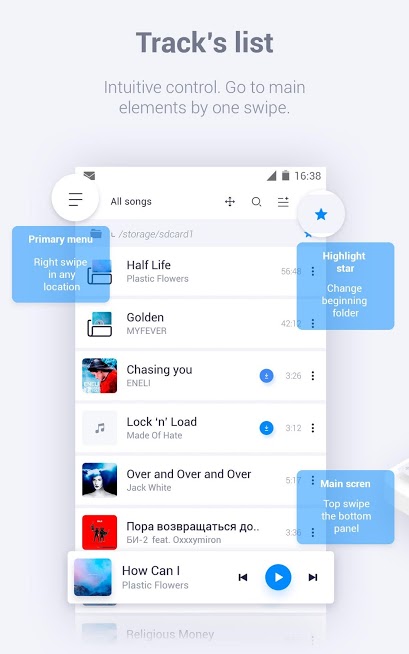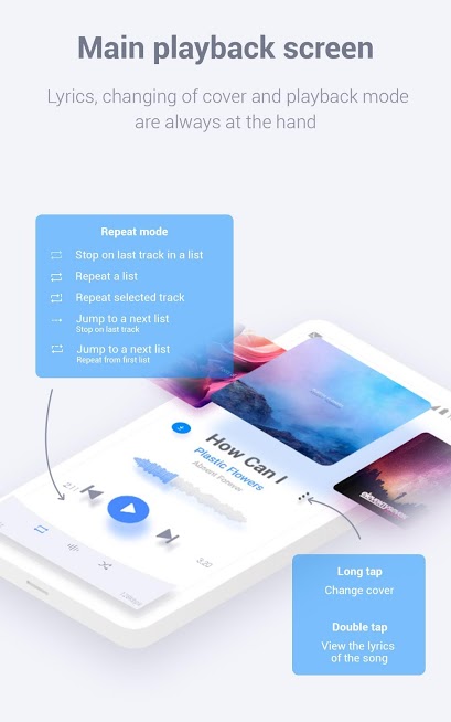 – نمایش اشعار موزیک از اینترنت با دسترسی آفلاین پس از دانلود. – یک کاور را انتخاب کنید. از جستجوی رایج برای کاور از اینترنت استفاده کنید. – ویرایش تگ ها، با استفاده از ویرایشگر برچسب دستی میتوانید به ویزایش بپردازید. – دسته موسیقی پخش موسیقی با : آلبوم ها هنرمند و یا پوشه ها. – ساپورت بسیاری از فرمت های صوتی. علاوه بر فرمت های محبوب صوتی FLAC MP3 CUE APE M4A و … پشتیبانی می شوند. – پشتیبانی Android Wear کنترل موسیقی خود ! – بهترین صدا. پخش موسیقی با وضوح بالا – تایمر خواب، تنظیم تایمر خواب برای مقدار معینی از آهنگ ها یا دقیقه. – تنظیمات دیگر مانند لیست انیمیشن و یا قفل صفحه نمایش – ابزارک ها و اعلان ها ظاهر ویدجت ها و اعلان ها را تغییر میدهد. – کنترل راحت با استفاده از یک هدست، با تلفن یا دکمه های ولوم تلفن .