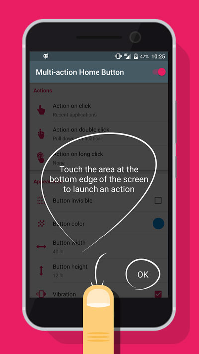 Multi-action Home Button PRO اپلیکیشن کاربردی می باشد که با نصب آن میتوانید دکمه ی نرم افزاری در صفحه ایجاد کنید و عمیات متعدد به ان اضافه کنید از جمله:دکمه ی Home – تنظیمات – برنامه های جدید – دکمه ی عقب و… .اگر دکمه Home هوم فیزیکی گوشی شما خراب شده است این برنامه قطعا برای شما مناسب خواهد بود. اگر دستگاه شما یک نوار جهت یابی ( صفحه اصلی، برگشت، دکمه های چندکاره) در صفحه دارد ، منطقه ی لمسی در بالای نوار جهت یابی خواهد بود.
