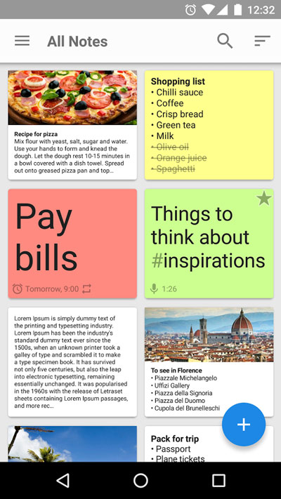 ✤ وجود یک فیلد متنی در متن اصلی برای نوشتن با هر طول ✤ اصول اضافی یادداشتها: ✤ عنوان به صورت پررنگ(bold) ✤ ٨ رنگ موجود برای انتخاب ✤ لیست های کاری، لیست های در حال انجام، لیستهای خرید و لیستهای در حال بررسی برای کنترل کارها ✤ استفاده از عکس برای ضمیمه ی یادداشت ✤ یادداشتهای صوتی با کیفیت بالا و ضبط صوتی M4A با حجم کم ✤ تبدیل گفتار به متن ✤ یادآور یکباره یا در مدت زمان معین همراه با چراغ اعلان چشمک زن ✤ نوار وضعیت برای نوشتن سریع یک یادداشت جدید ✤ پشتیبانی از برچسب ها ✤ بخش مورد علاقه برای افزودن یادداشتهای مهم ✤ جستجوی سریع برای گرفتن سریع اطلاعات ✤ ویژگی بک آپ گیری و بازیابی ✤ همگام سازی با گوگل درایو و Dropbox ✤ ویجت های کارآمد برای دسترسی سریع به یادداشت ها: ✤ افزودن یاداشت سریع برای دسترسی سریع به برنامه ✤ ویجت هایی با اندازه گیری دوباره برای نمایش یادداشت های واحد ✤ ویجت هایی با اندازه گیری دوباره برای نمایش یادداشت های شما از لیست انتخابی ✤ اقدامات مفید در چندین یادداشت در یک زمان واحد ✤ مرتب کردن یادداشتها با تاریخ تغییر، تاریخ ایجاد ، تاریخ یادآوری و با نام بادداشت های موردعلاقه ✤ اشتراک با دوستان و خانواده از طریق پیام کوتاه، ایمیل، فیسبوک، توییتر و غیره