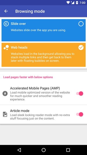 4- دارای قابلیت وب هدز(web heads) که با لود کردن هر صفحه در پس زمینه باعث میشود در وقت شما صرفه جویی شود که البته این قابلیت در اندرویدهای 5.0 و بالاتر فعال میباشد
